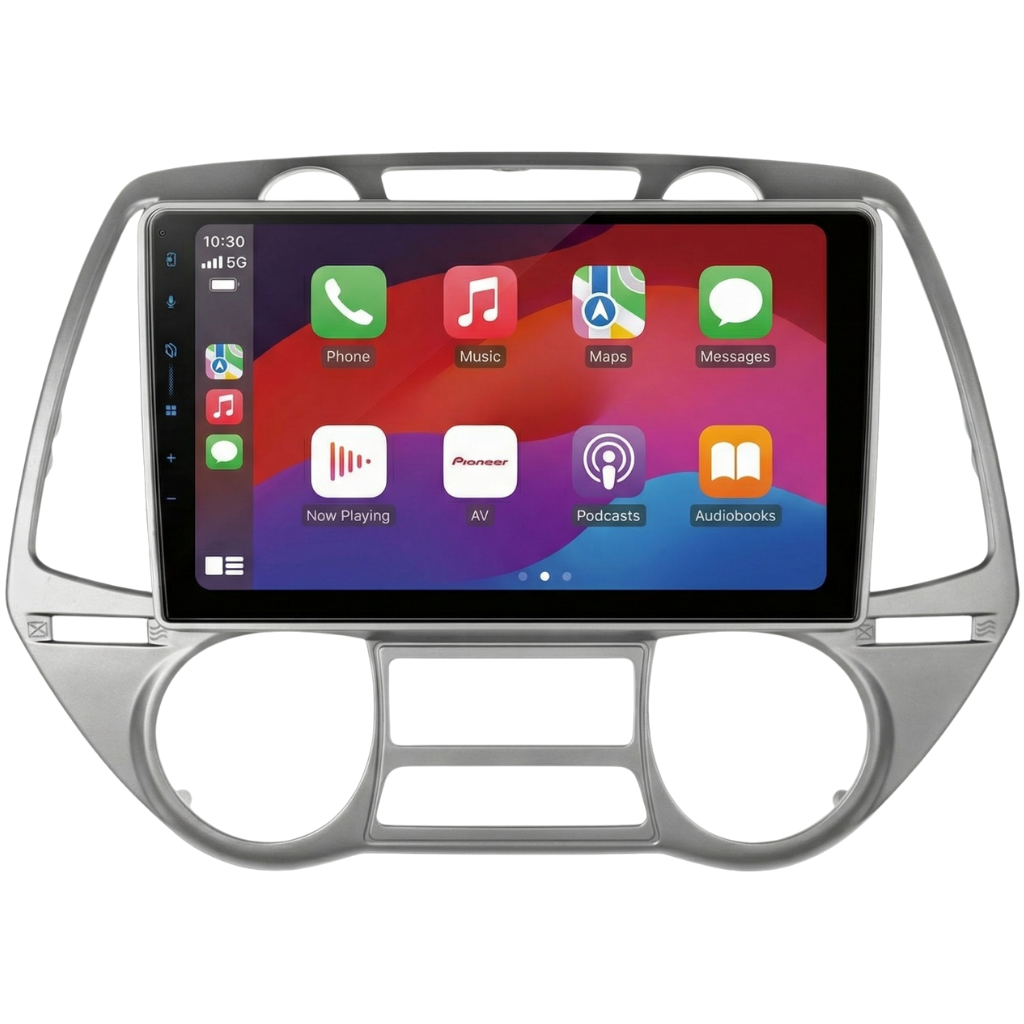 Complete installatiekit, bestaande uit het Pioneer SPH-PF97BT Multimedia Systeem en een voertuigspecifiek 9" Montageframe voor de Hyundai i-20 (2009-2012) met Automatische Airco, inclusief bekabeling en stuurwielinterface.