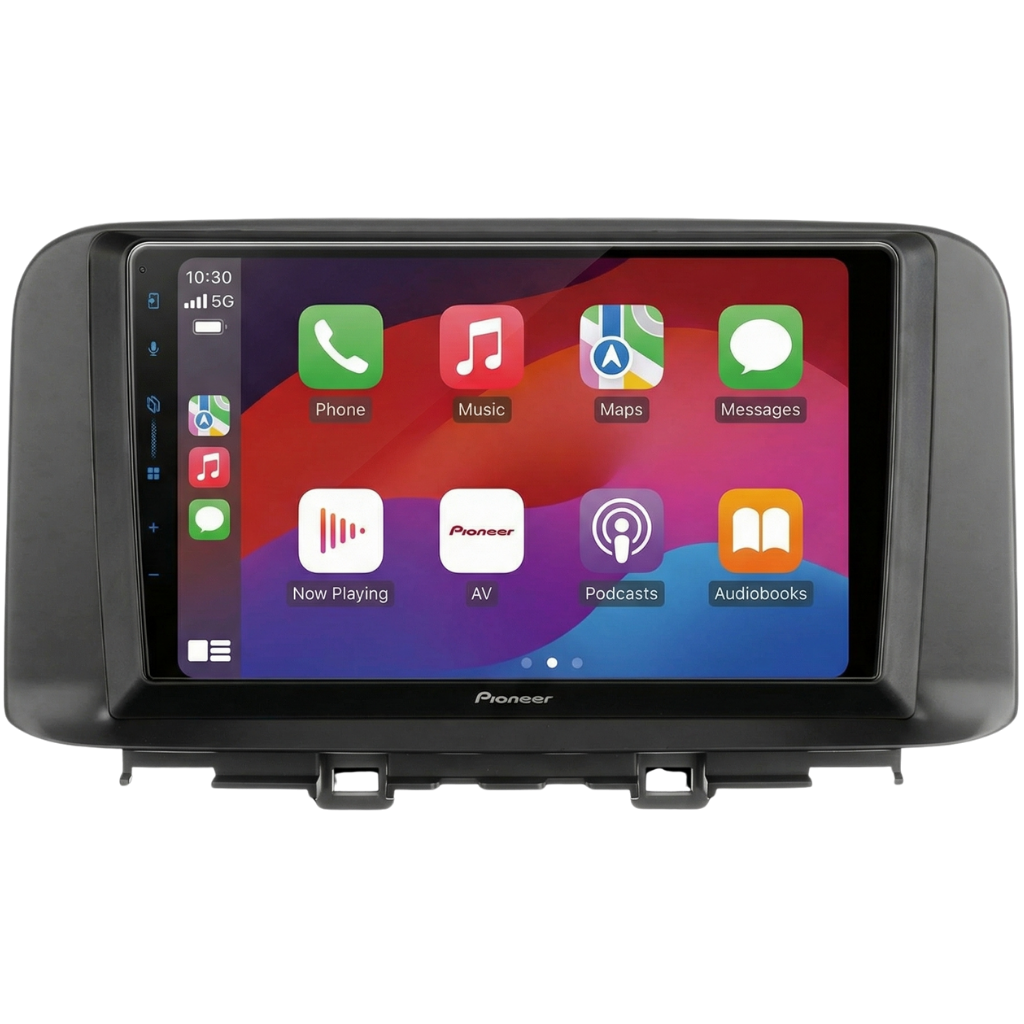 Complete installatiekit met het Pioneer SPH-PF97BT Multimedia Systeem, een voertuigspecifiek 9'' Montageframe in Zwart, inclusief bekabeling en stuurwielinterface, geschikt voor de Hyundai Kona ('18-).