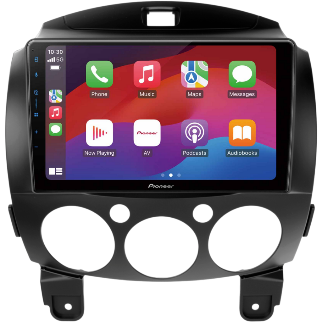 Complete installatiekit met het Pioneer SPH-PF97BT Multimedia Systeem en een voertuigspecifiek 9" Montageframe, inclusief bekabeling en stuurwielinterface, geschikt voor de Mazda 2 (2007-2015).